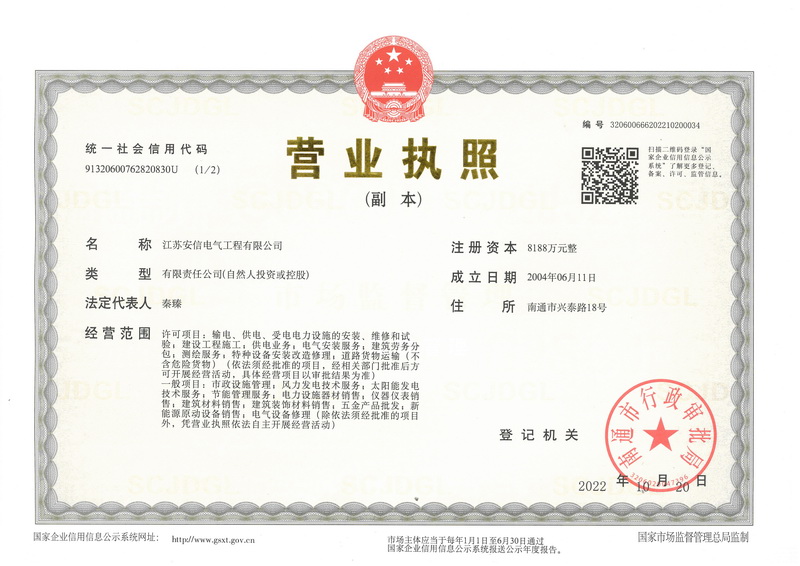 江蘇安信電氣工程有限公司,成立于2004年6月,注冊資金8188萬元,占地22000平方米,位于南通市興泰路18號,東接南通站、興東機場,西鄰南通西站、滬蘇通公鐵長江大橋,交通便捷。